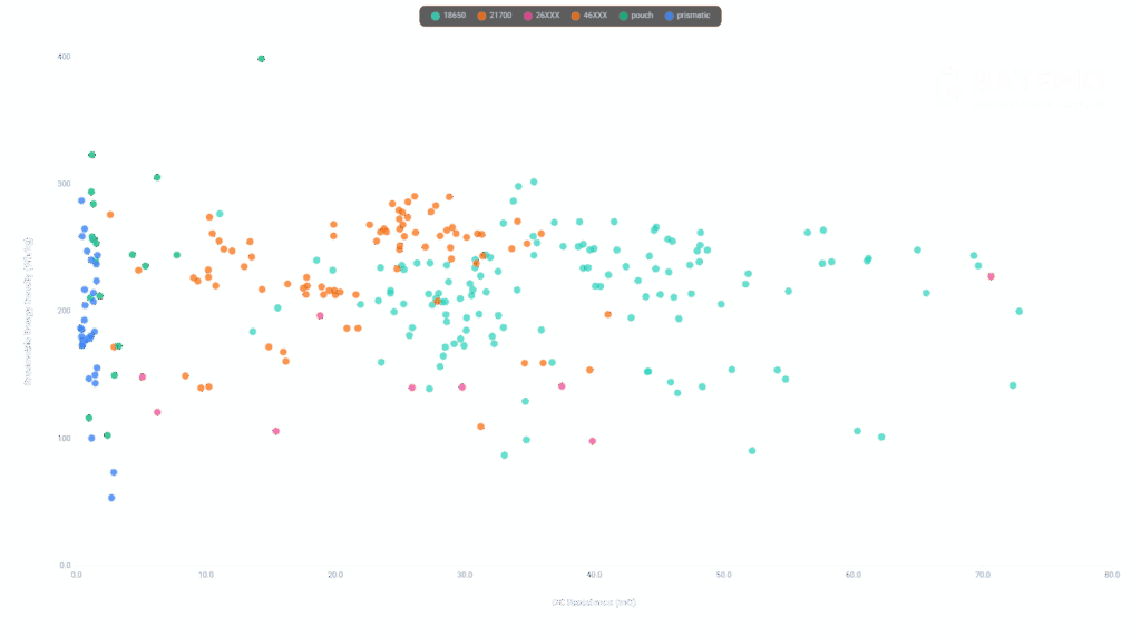 The INR2170-45D(B) from BAK’s full-tab 2170 cell series checks in at 248 Wh/kg and 2.12 kW/kg, while the EVE Energy 21700 40PL is designed towards even more power: With 233 Wh/kg and 2.35 kW/kg, the 40PL extends the technology front of 21700 cells in the Batemo Cell Explorer.