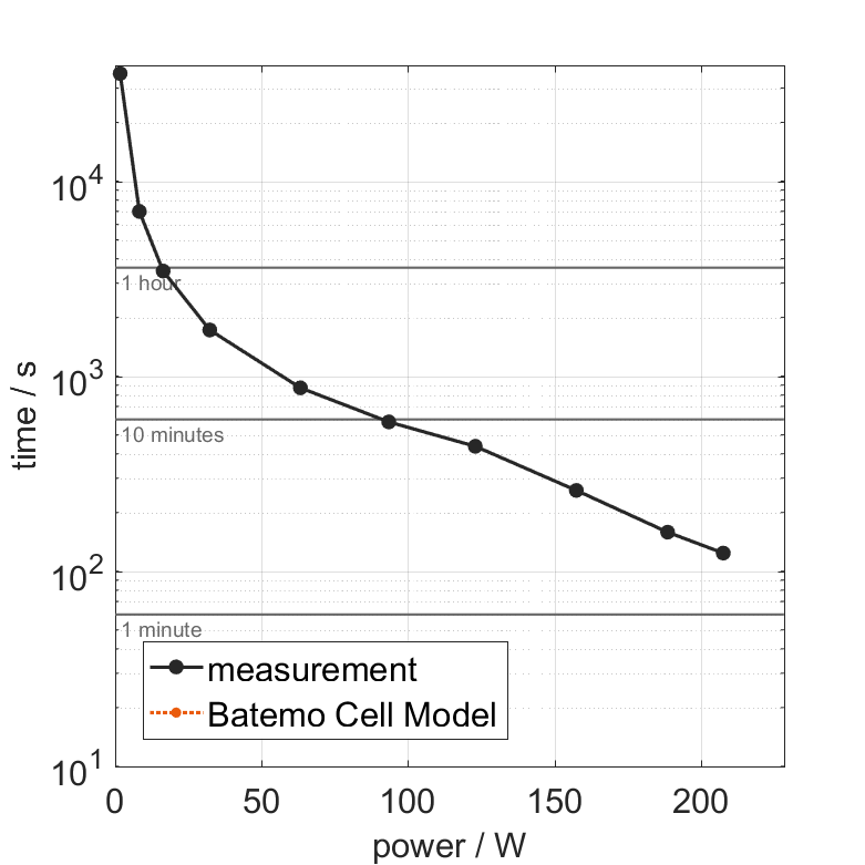 连续功率是完全放电而不使电池过热的最高功率。因此,电池在25°C的环境温度下从100%的充电状态(SOC)开始,以恒定电流放电,直到剩余充电状态降至10%或达到下限电压限制2.5V,或最大表面温度的90%(72°C)。 峰值功率是电池能够在5分钟内提供的功率。因此,电池在25°C的环境温度下从100% SOC开始,以恒定电流放电,直到5分钟后达到下限电压限制2.5V或最大表面温度80°C。对于达到最大温度限制的电池,测量的功率直接作为峰值功率。对于在5分钟后未达到最大表面温度但首先达到下限电压限制的电池,测量的功率会乘以一个修正系数,以估计在5分钟内会将电池加热到最大表面温度的功率。 热边界条件为自然对流。这些操作条件可能超出电池制造商的规格。 |