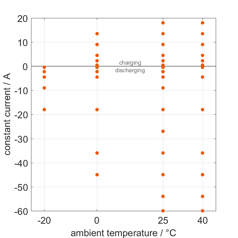 电池在各种环境温度下,通过不同的恒定电流从 100% SOC 放电或从 0% SOC 充电。热边界条件为自然对流。测量会在电压达到 2.5V 或 4.2V 或表面温度达到 80°C 时停止。图表显示了在哪些环境温度和恒定电流下可以进行测量。