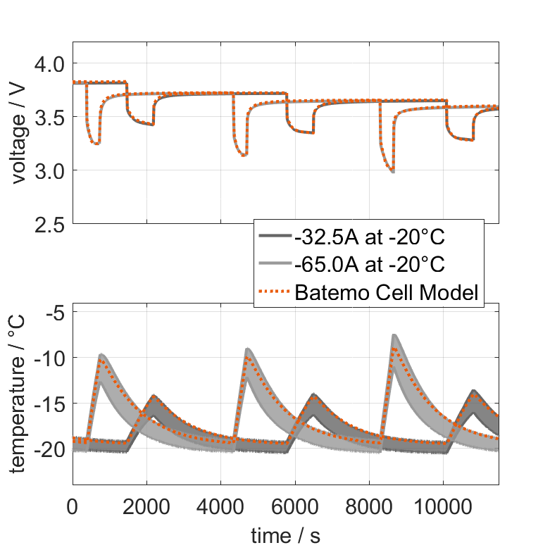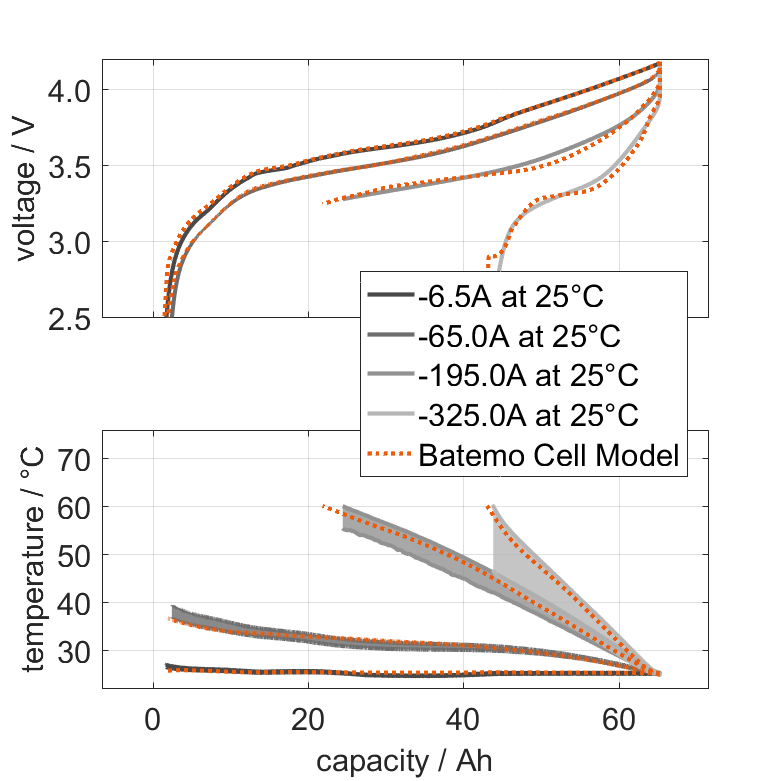 百特模型通过比较以下范围内的电池仿真和测量数据,展示了百特模型电池的准确性和有效性。验证非常广泛,实验特性覆盖了电池的整个操作区域:在低温和高温下,直到最大电流,并且在整个电量范围内。