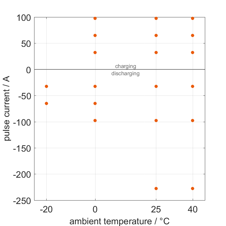 电池在各种环境温度下,经过无负载阶段后通过电流脉冲从 100% SOC 放电或从 0% SOC 充电。热边界条件为自然对流。测量会在电压达到 2.5V 或 4.2V 或表面温度达到 60°C 时停止。图表显示了在哪些环境温度和脉冲电流下可以进行测量。