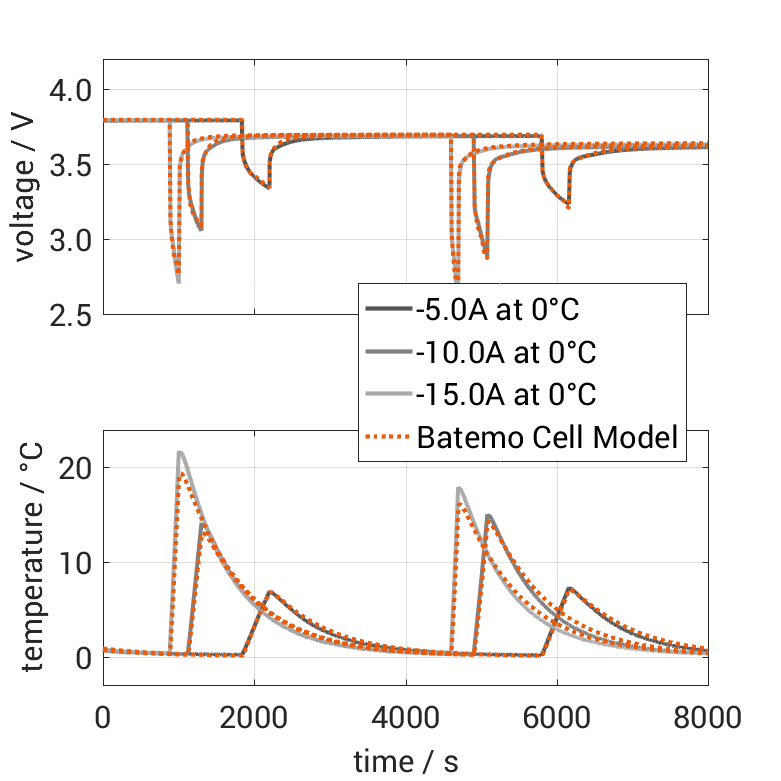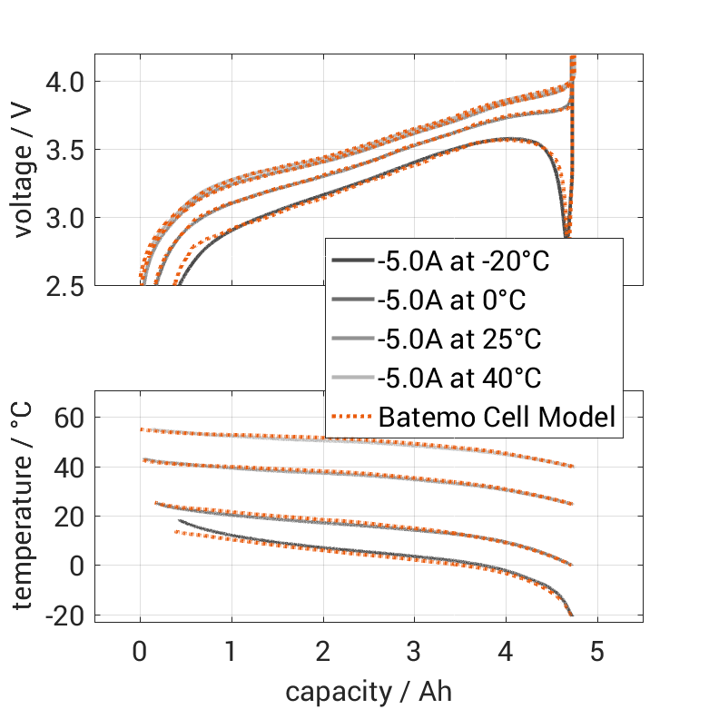 百特模型通过比较以下范围内的电池仿真和测量数据,展示了百特模型电池的准确性和有效性。验证非常广泛,实验特性覆盖了电池的整个操作区域:在低温和高温下,直到最大电流,并且在整个电量范围内。