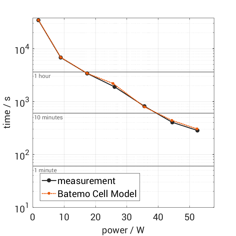 电池单元在 25°C 下以不同的恒定电流从 100% SOC 放电。热边界条件为自由对流。当电压达到 2.5V 或表面温度达到 55°C 时,测量停止。图表显示了实验的持续时间和平均功率。