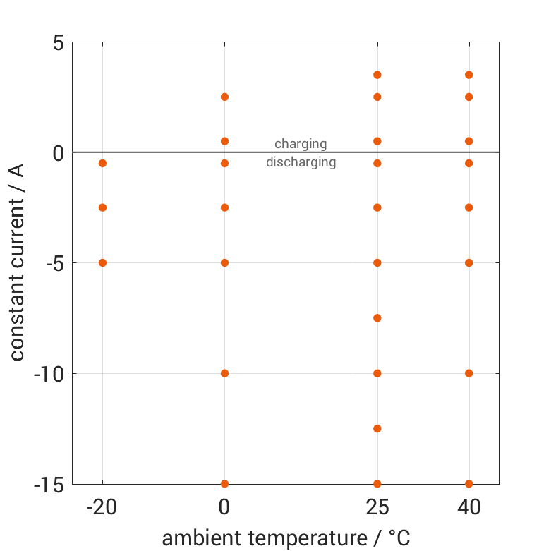 电池在各种环境温度下,通过不同的恒定电流从 100% SOC 放电或从 0% SOC 充电。热边界条件为自然对流。测量会在电压达到 2.5V 或 4.2V 或表面温度达到 55°C 时停止。图表显示了在哪些环境温度和恒定电流下可以进行测量。