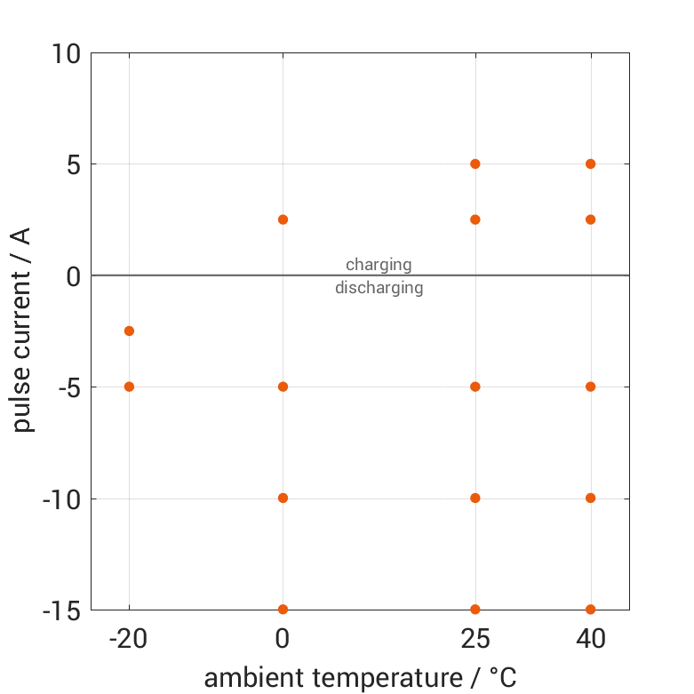 电池在各种环境温度下,经过无负载阶段后通过电流脉冲从 100% SOC 放电或从 0% SOC 充电。热边界条件为自然对流。测量会在电压达到 2.5V 或 4.2V 或表面温度达到 55°C 时停止。图表显示了在哪些环境温度和脉冲电流下可以进行测量。