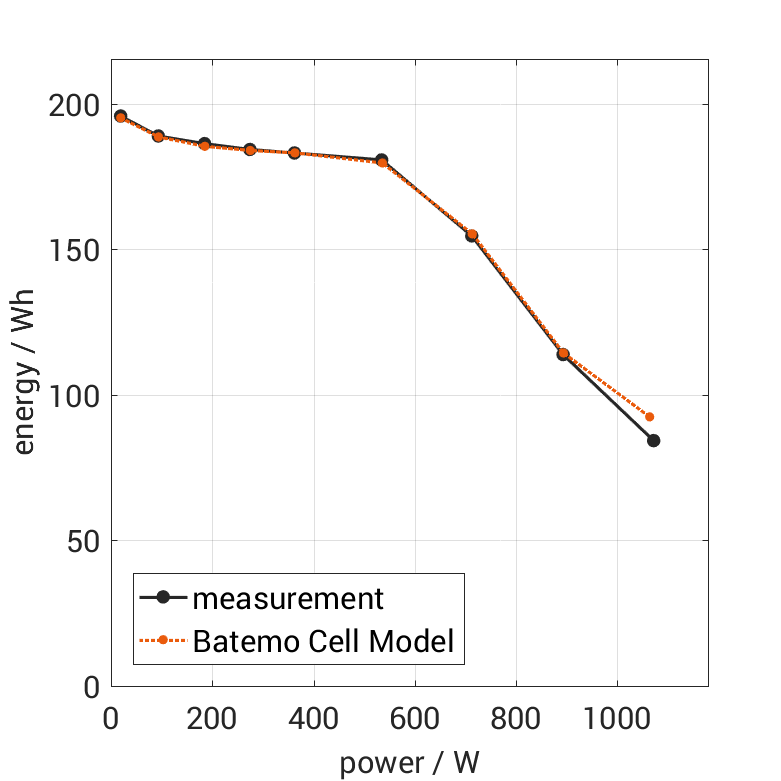 电池单元在 25°C 下以不同的恒定电流从 100% SOC 放电。热边界条件为自由对流。当电压达到 2.8V 或表面温度达到 60°C 时,测量停止。图表显示了实验的交换能量和平均功率。