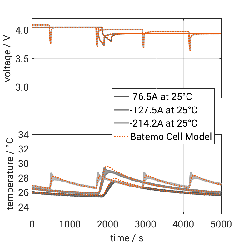 百特模型通过比较以下范围内的电池仿真和测量数据,展示了百特模型电池的准确性和有效性。验证非常广泛,实验特性覆盖了电池的整个操作区域:在低温和高温下,直到最大电流,并且在整个电量范围内。