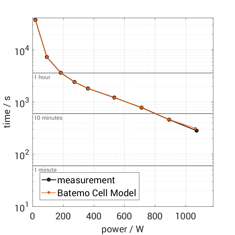 电池单元在 25°C 下以不同的恒定电流从 100% SOC 放电。热边界条件为自由对流。当电压达到 2.8V 或表面温度达到 60°C 时,测量停止。图表显示了实验的持续时间和平均功率。