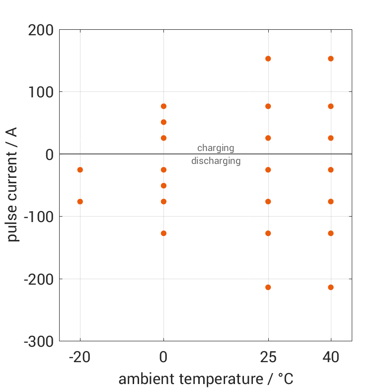 电池在各种环境温度下,经过无负载阶段后通过电流脉冲从 100% SOC 放电或从 0% SOC 充电。热边界条件为自然对流。测量会在电压达到 2.8V 或 4.2V 或表面温度达到 60°C 时停止。图表显示了在哪些环境温度和脉冲电流下可以进行测量。
