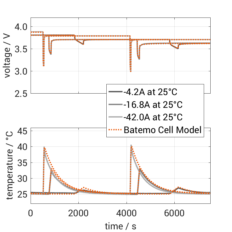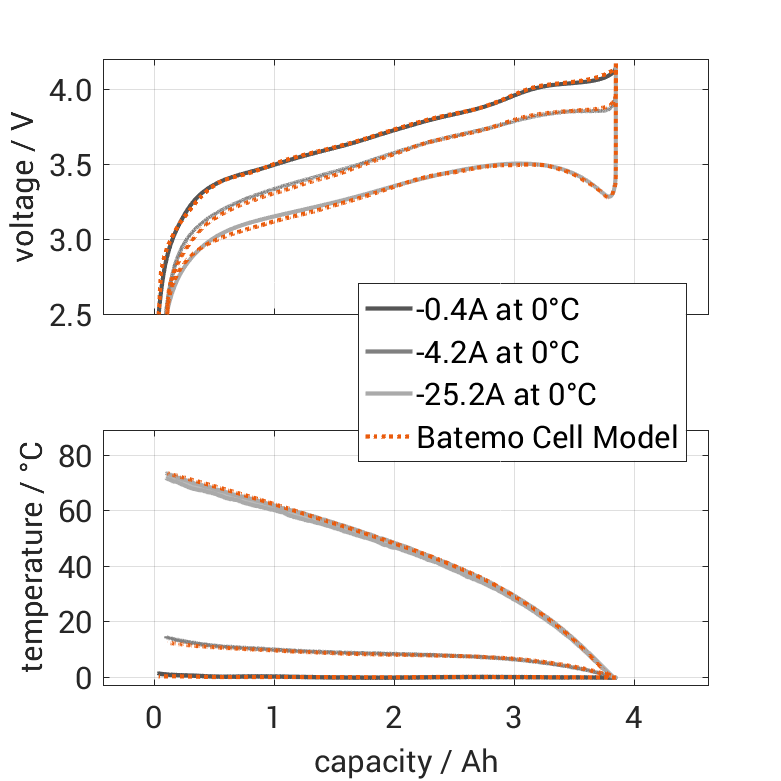 百特模型通过比较以下范围内的电池仿真和测量数据,展示了百特模型电池的准确性和有效性。验证非常广泛,实验特性覆盖了电池的整个操作区域:在低温和高温下,直到最大电流,并且在整个电量范围内。