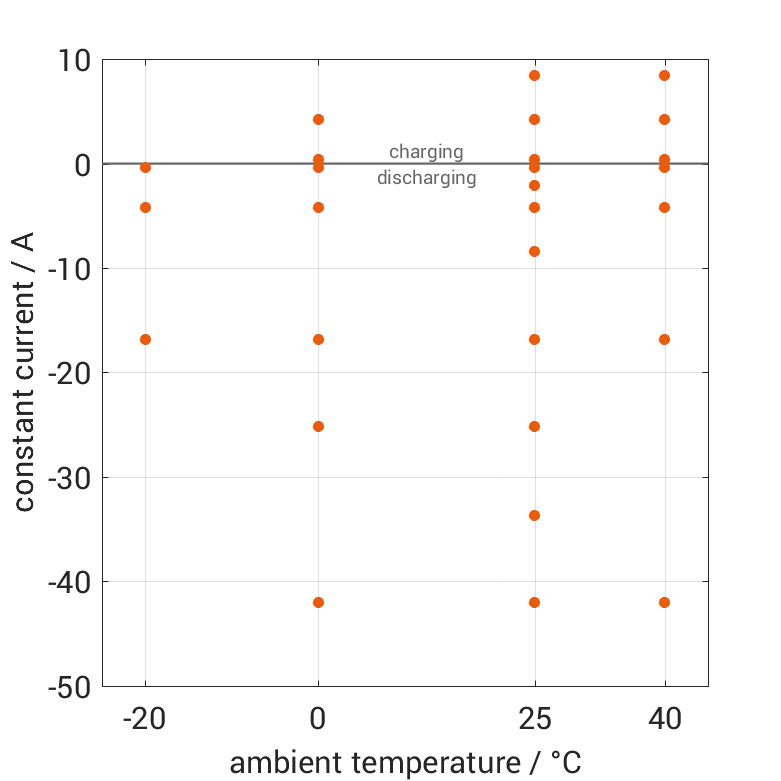 电池在各种环境温度下,通过不同的恒定电流从 100% SOC 放电或从 0% SOC 充电。热边界条件为自然对流。测量会在电压达到 2.5V 或 4.2V 或表面温度达到 80°C 时停止。图表显示了在哪些环境温度和恒定电流下可以进行测量。