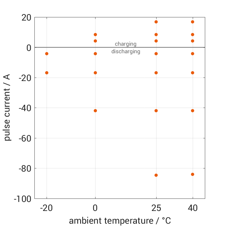 电池在各种环境温度下,经过无负载阶段后通过电流脉冲从 100% SOC 放电或从 0% SOC 充电。热边界条件为自然对流。测量会在电压达到 2.5V 或 4.2V 或表面温度达到 80°C 时停止。图表显示了在哪些环境温度和脉冲电流下可以进行测量。