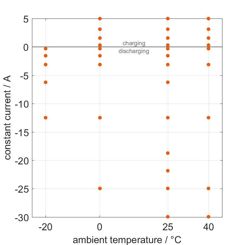 电池在各种环境温度下,通过不同的恒定电流从 100% SOC 放电或从 0% SOC 充电。热边界条件为自然对流。测量会在电压达到 2V 或 4.2V 或表面温度达到 80°C 时停止。图表显示了在哪些环境温度和恒定电流下可以进行测量。