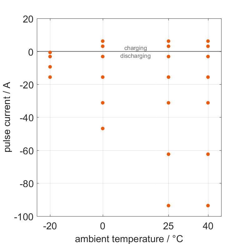 电池在各种环境温度下,经过无负载阶段后通过电流脉冲从 100% SOC 放电或从 0% SOC 充电。热边界条件为自然对流。测量会在电压达到 2V 或 4.2V 或表面温度达到 80°C 时停止。图表显示了在哪些环境温度和脉冲电流下可以进行测量。
