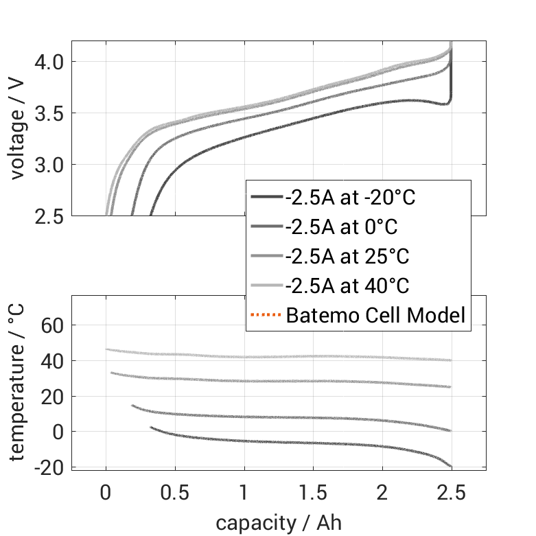 锂离子 Samsung INR18650-25R(5) 电池的 Batemo 电池模型是一个高精度的物理电池模型,具有全局有效性。作为一个数字孪生模型,它可通过模拟将您的决策无缝集成到您的研究、开发和电池分析中。有关巴特莫电池模型的特性和功能的详细信息,请参见 详情。Batemo 通过比较以下范围内的电池模拟和测量数据,证明了 Batemo 电池模型的准确性和有效性。验证范围广泛,实验特征涵盖电池的整个运行区域: 在低温和高温、最大电流和整个充电状态范围内。