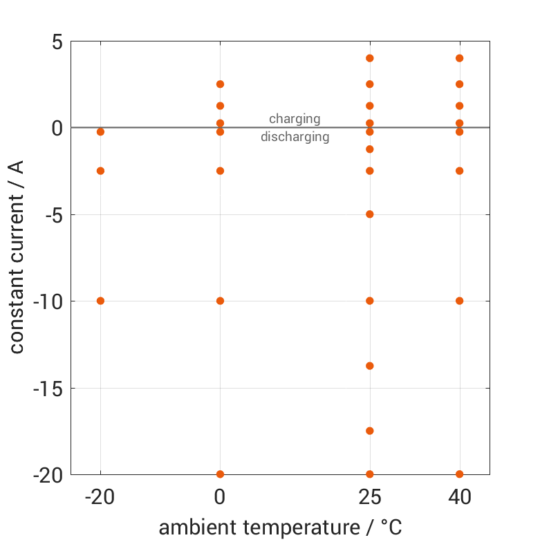 电池在各种环境温度下,通过不同的恒定电流从 100% SOC 放电或从 0% SOC 充电。热边界条件为自然对流。测量会在电压达到 2.5V 或 4.2V 或表面温度达到 75°C 时停止。图表显示了在哪些环境温度和恒定电流下可以进行测量。
