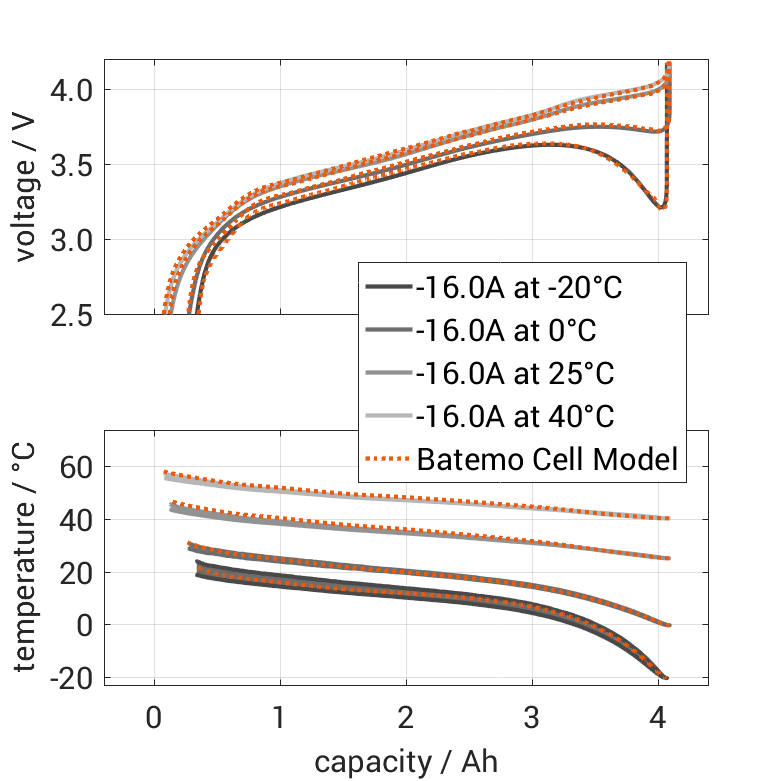 百特模型通过比较以下范围内的电池仿真和测量数据,展示了百特模型电池的准确性和有效性。验证非常广泛,实验特性覆盖了电池的整个操作区域:在低温和高温下,直到最大电流,并且在整个电量范围内。