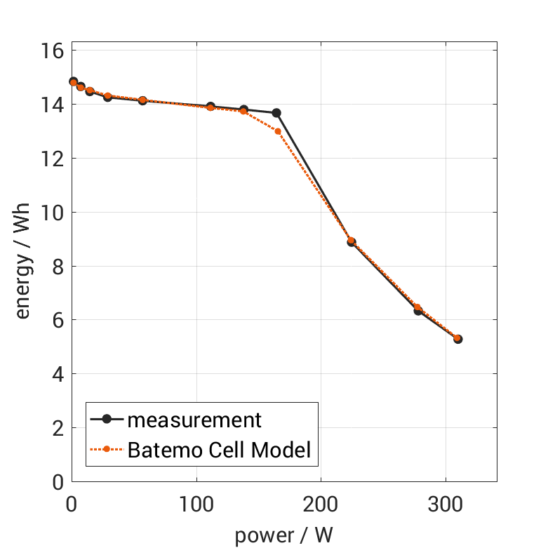 电池单元在 25°C 下以不同的恒定电流从 100% SOC 放电。热边界条件为自由对流。当电压达到 2.5V 或表面温度达到 80°C 时,测量停止。图表显示了实验的交换能量和平均功率。