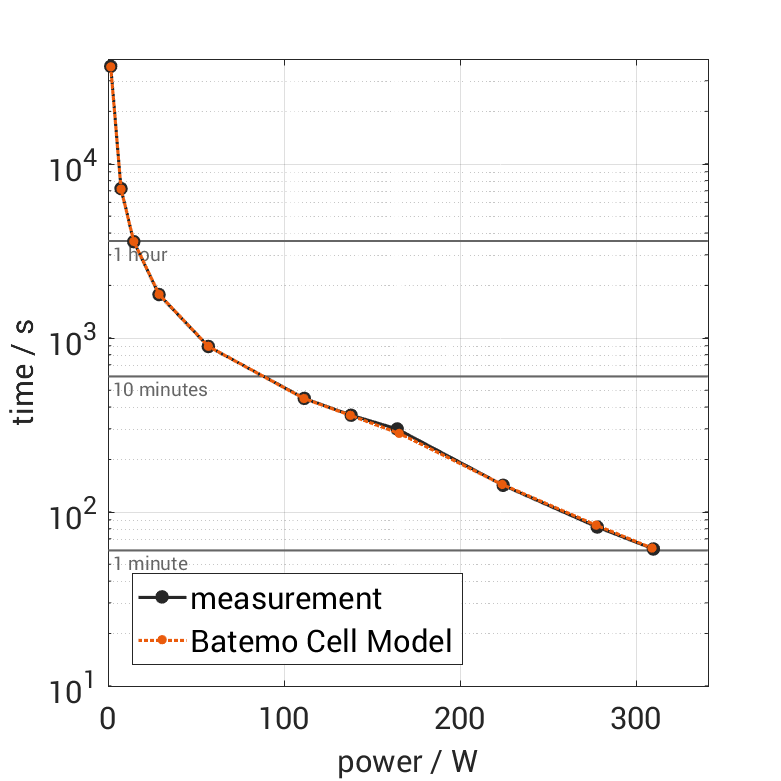 电池单元在 25°C 下以不同的恒定电流从 100% SOC 放电。热边界条件为自由对流。当电压达到 2.5V 或表面温度达到 80°C 时,测量停止。图表显示了实验的持续时间和平均功率。