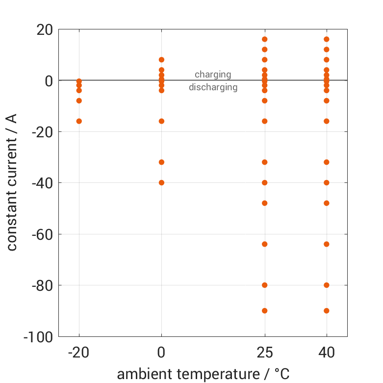 电池在各种环境温度下,通过不同的恒定电流从 100% SOC 放电或从 0% SOC 充电。热边界条件为自然对流。测量会在电压达到 2.5V 或 4.2V 或表面温度达到 80°C 时停止。图表显示了在哪些环境温度和恒定电流下可以进行测量。