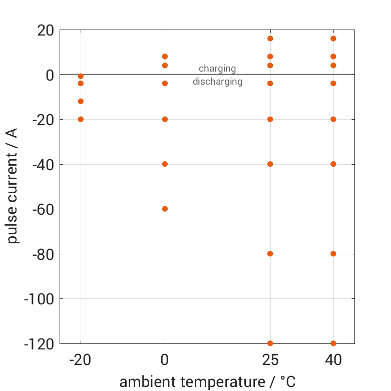 The cell is discharged from 100% SOC or charged from 0% SOC with current pulses followed by no-load phases at different ambient temperatures. The thermal boundary condition is free convection. The measurement stops when reaching either the voltage of 2.5V or 4.2V or the surface temperature of 80°C. The graph shows for which ambient temperatures and pulse currents measurements are available.
