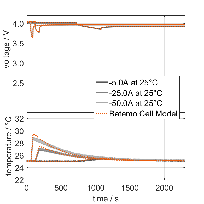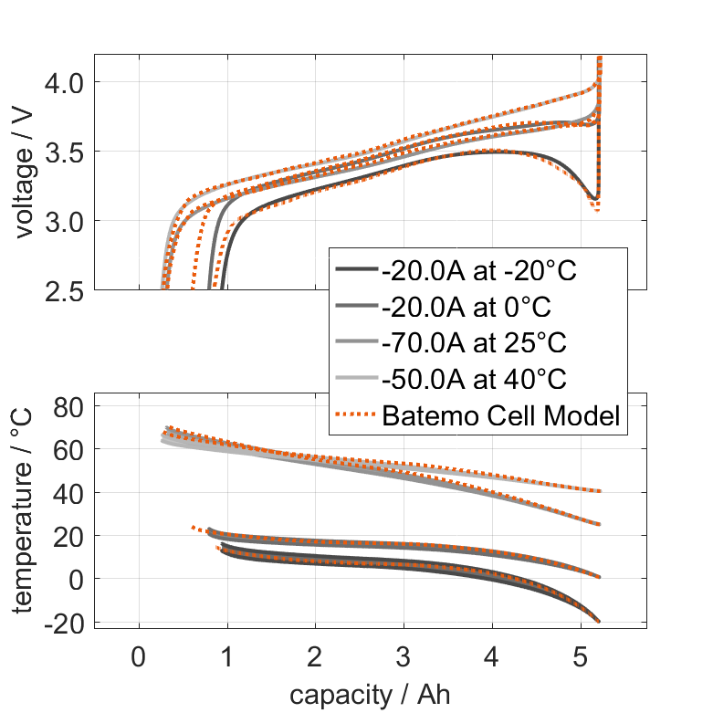 Batemo demonstrates the accuracy and validity of the Batemo Cell Model by comparing battery simulation and measurement data in the range given below. Validation is extensive, experimental characterization covers the total operational area of the cell: At low and high temperatures, up to the maximal current and in the whole state of charge range.