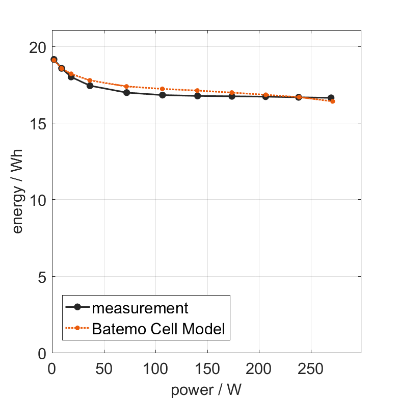 All quantities are measurement results from the Batemo battery laboratory. The continuous power is the highest power that completely discharges the cell without overheating it. Therefore, the cell is discharged from 100% state of charge (SOC) at an ambient temperature of 25°C with a constant current until a residual state of charge of 10% and either the lower voltage limit of 2.5V or 90% of the maximum surface temperature ( 68°C) is reached. The peak power is the power the cell can supply for 5 minutes. The cell is therefore discharged from 100% SOC at an ambient temperature of 25°C with a constant current until it reaches either the lower voltage limit of 2.5V or the maximum surface temperature of 75°C after 5 minutes. For cells that reach the maximum temperature limit, the measured power is directly taken as peak power. For cells that do not reach the maximum surface temperature after 5 minutes because they reach the lower voltage limit first, the measured power is multiplied by a correction factor that estimates the power that would have heated the cell to the maximum surface temperature within 5 minutes. The thermal boundary condition is free convection. These operating conditions may be outside the cell manufacturer’s specification. |