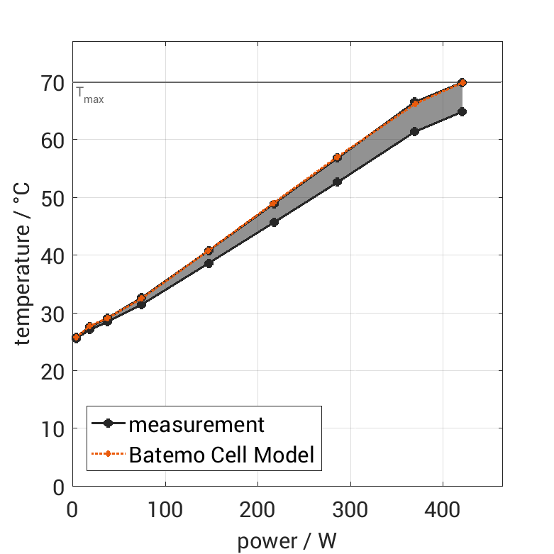 The cell is discharged from 100% SOC with different constant currents at 25°C. The thermal boundary condi­tion is free convec­tion. The measure­ment stops when reaching either the voltage of 2.8V or the surface temper­a­ture of 70°C. The graph shows the cell surface temper­a­ture at the end and the derived average power of the experiment.