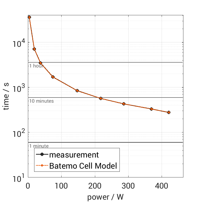 The cell is discharged from 100% SOC with different constant currents at 25°C. The thermal boundary condi­tion is free convec­tion. The measure­ment stops when reaching either the voltage of 2.8V or the surface temper­a­ture of 70°C. The graph shows the derived exper­i­ment duration and average power of the experiment.