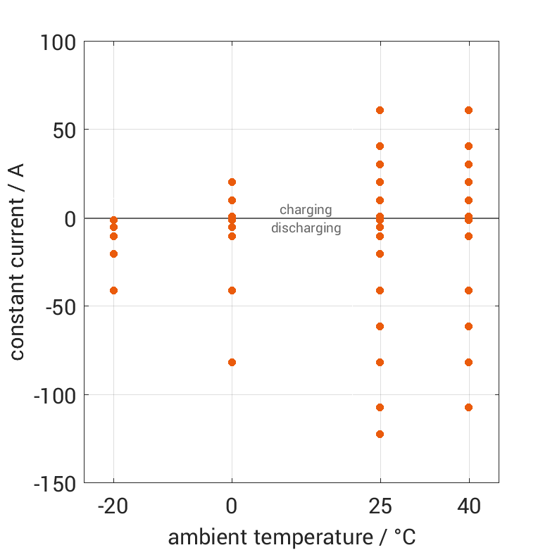 The cell is discharged from 100% SOC or charged from 0% SOC with different constant currents at different ambient temper­a­tures. The thermal boundary condi­tion is free convec­tion. The measure­ment stops when reaching either the voltage of 2.8V or 4.2V or the surface temper­a­ture of 70°C. The graph shows for which ambient temper­a­tures and charging and discharging constant currents measure­ments are available.