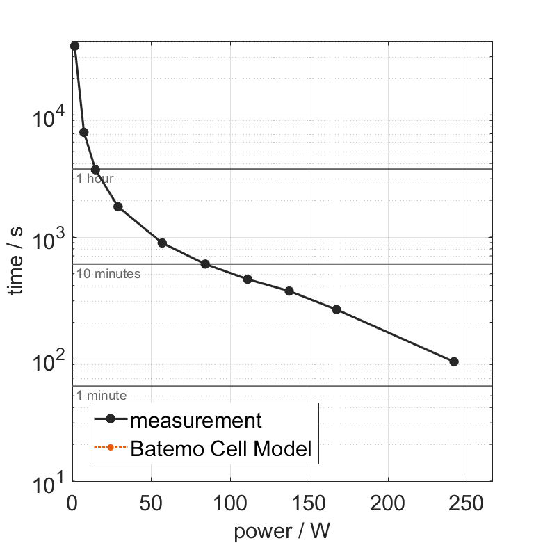 All quantities are measurement results from the Batemo battery laboratory. The continuous power is the highest power that completely discharges the cell without overheating it. Therefore, the cell is discharged from 100% state of charge (SOC) at an ambient temperature of 25°C with a constant current until a residual state of charge of 10% and either the lower voltage limit of 2.5V or 90% of the maximum surface temperature ( 72°C) is reached. The peak power is the power the cell can supply for 5 minutes. The cell is therefore discharged from 100% SOC at an ambient temperature of 25°C with a constant current until it reaches either the lower voltage limit of 2.5V or the maximum surface temperature of 80°C after 5 minutes. For cells that reach the maximum temperature limit, the measured power is directly taken as peak power. For cells that do not reach the maximum surface temperature after 5 minutes because they reach the lower voltage limit first, the measured power is multiplied by a correction factor that estimates the power that would have heated the cell to the maximum surface temperature within 5 minutes. The thermal boundary condition is free convection. These operating conditions may be outside the cell manufacturer’s specification. |