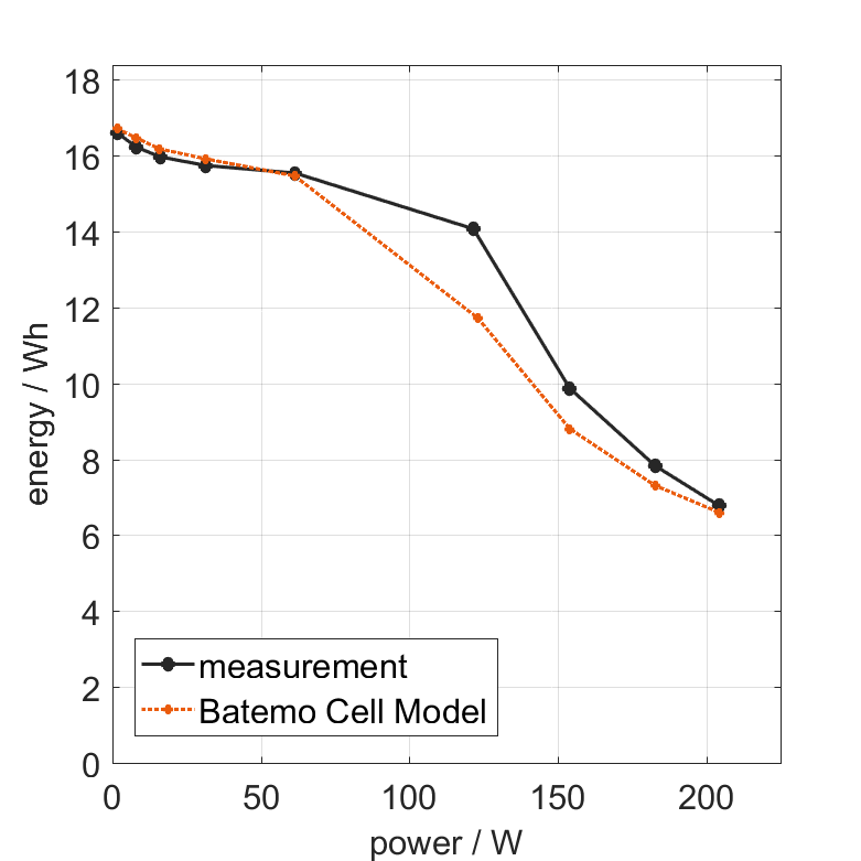 Moreover, the validation of the Batemo Cell Model is fully transparent. The Batemo Cell Data contains the raw measurement and simulation data. For all experiments the voltage, temperature, power and energy accuracies are calculated. This allows straight-forward evaluation and analysis of the Batemo Cell Model validity. The graphs show a selection of characteristic data of the cell BAK Battery INR2170-45D(B) to evaluate the cell performance.