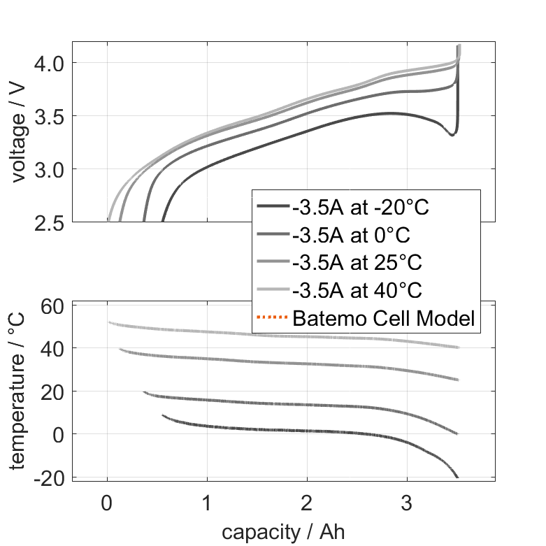 The Batemo Cell Model of the lithium-ion battery cell BAK Battery N18650CR-35E is a high-precision, physical cell model with global validity. As a digital twin it seamlessly integrates into your research, development and battery analytics by basing your decisions on simulations. See the details to learn more about the features and capabilities of the Batemo Cell Model. Batemo demonstrates the accuracy and validity of the Batemo Cell Model by comparing battery simulation and measurement data in the range given below. Validation is extensive, experimental characterization covers the total operational area of the cell: At low and high temperatures, up to the maximal current and in the whole state of charge range.