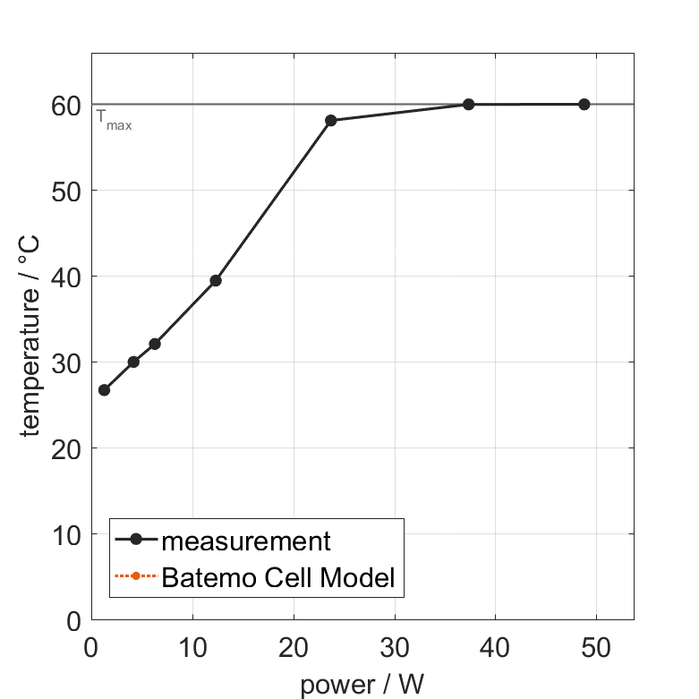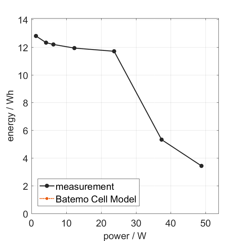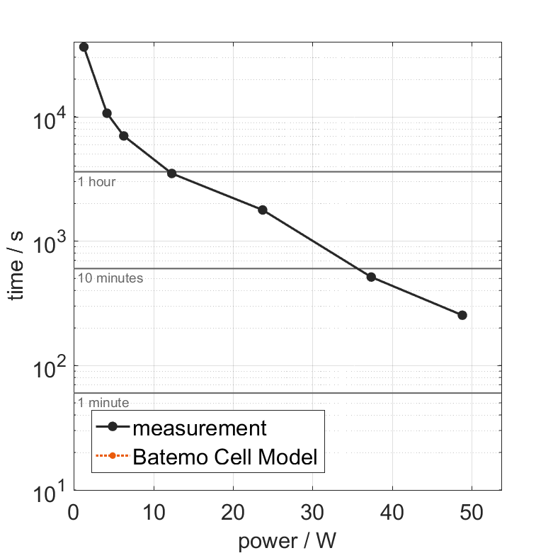 All quantities are measurement results from the Batemo battery laboratory. The continuous power is the highest power that completely discharges the cell without overheating it. Therefore, the cell is discharged from 100% state of charge (SOC) at an ambient temperature of 25°C with a constant current until a residual state of charge of 10% and either the lower voltage limit of 2.5V or 90% of the maximum surface temperature ( 54°C) is reached. The peak power is the power the cell can supply for 5 minutes. The cell is therefore discharged from 100% SOC at an ambient temperature of 25°C with a constant current until it reaches either the lower voltage limit of 2.5V or the maximum surface temperature of 60°C after 5 minutes. For cells that reach the maximum temperature limit, the measured power is directly taken as peak power. For cells that do not reach the maximum surface temperature after 5 minutes because they reach the lower voltage limit first, the measured power is multiplied by a correction factor that estimates the power that would have heated the cell to the maximum surface temperature within 5 minutes. The thermal boundary condition is free convection. These operating conditions may be outside the cell manufacturer’s specification. |
