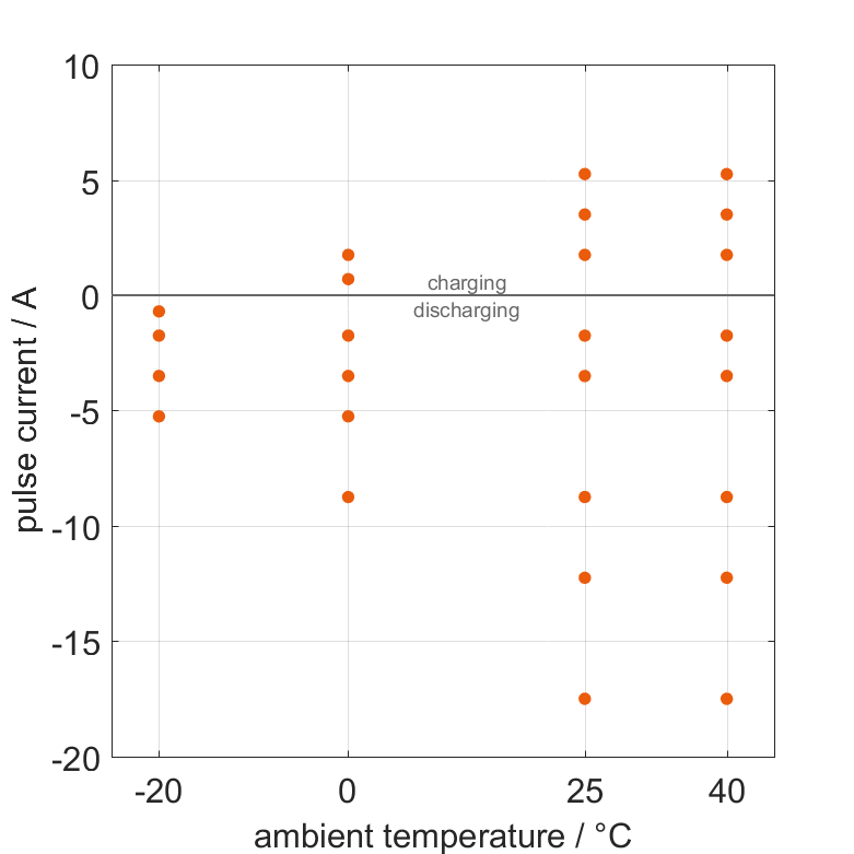 The cell is discharged from 100% SOC or charged from 0% SOC with current pulses followed by no-load phases at different ambient temperatures. The thermal boundary condition is free convection. The measurement stops when reaching either the voltage of 2.5V or 4.2V or the surface temperature of 60°C. The graph shows for which ambient temperatures and pulse currents measurements are available.