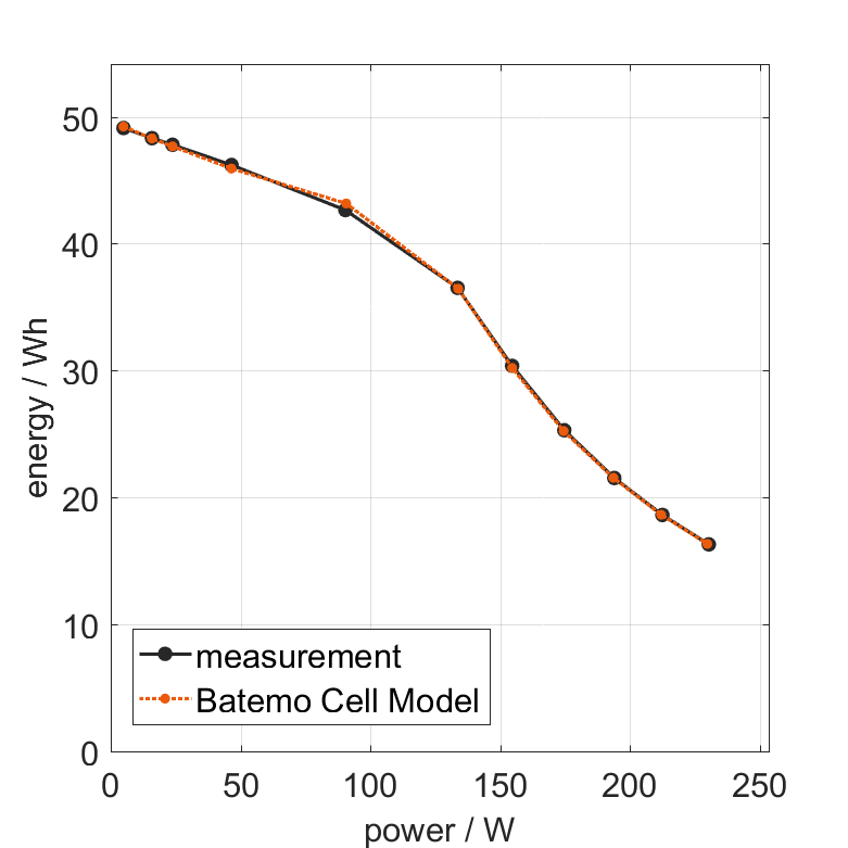 The cell is discharged from 100% SOC with different constant currents at 25°C. The thermal boundary condi­tion is free convec­tion. The measure­ment stops when reaching either the voltage of 2V or the surface temper­a­ture of 60°C. The graph shows the derived exchanged energy and average power of the experiment.