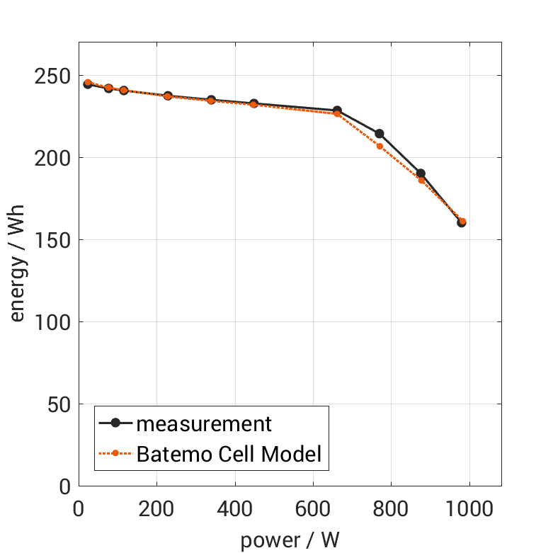 The cell is discharged from 100% SOC with different constant currents at 25°C. The thermal boundary condi­tion is free convec­tion. The measure­ment stops when reaching either the voltage of 2V or the surface temper­a­ture of 55°C. The graph shows the derived exchanged energy and average power of the experiment.