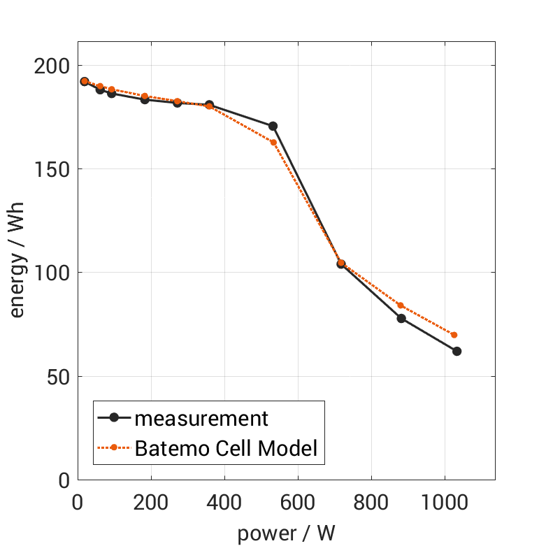 The cell is discharged from 100% SOC with different constant currents at 25°C. The thermal boundary condi­tion is free convec­tion. The measure­ment stops when reaching either the voltage of 2.8V or the surface temper­a­ture of 55°C. The graph shows the derived exchanged energy and average power of the experiment.