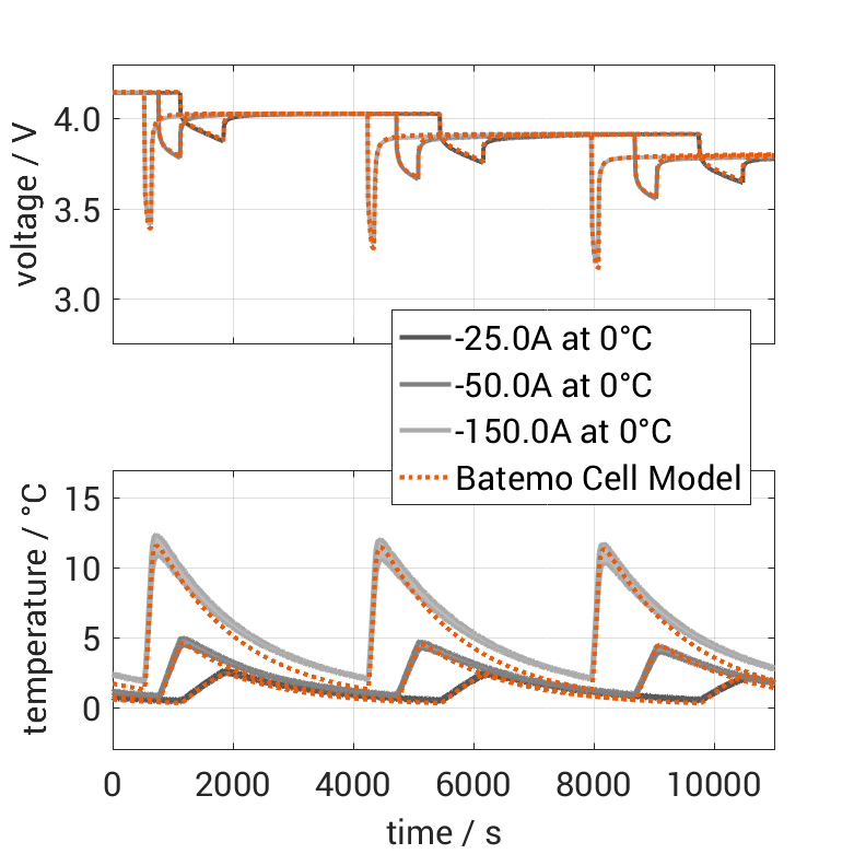 Batemo demon­strates the accuracy and validity of the Batemo Cell Model by comparing battery simula­tion and measure­ment data in the range given below. Valida­tion is exten­sive, exper­i­mental charac­ter­i­za­tion covers the total opera­tional area of the cell: At low and high temper­a­tures, up to the maximal current and in the whole state of charge range.