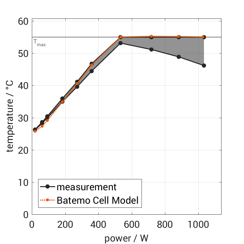 The cell is discharged from 100% SOC with different constant currents at 25°C. The thermal boundary condi­tion is free convec­tion. The measure­ment stops when reaching either the voltage of 2.8V or the surface temper­a­ture of 55°C. The graph shows the cell surface temper­a­ture at the end and the derived average power of the experiment.