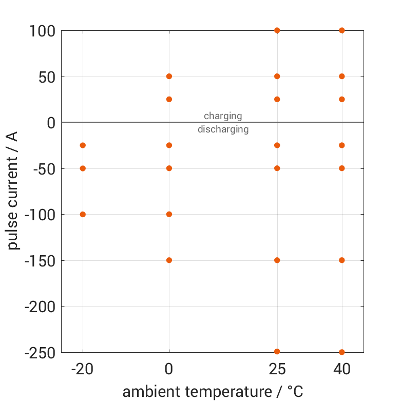 The cell is discharged from 100% SOC or charged from 0% SOC with current pulses followed by no-load phases at different ambient temper­a­tures. The thermal boundary condi­tion is free convec­tion. The measure­ment stops when reaching either the voltage of 2.8V or 4.3V or the surface temper­a­ture of 55°C. The graph shows for which ambient temper­a­tures and pulse currents measure­ments are available.