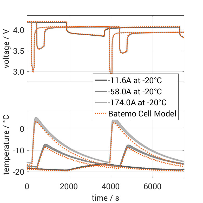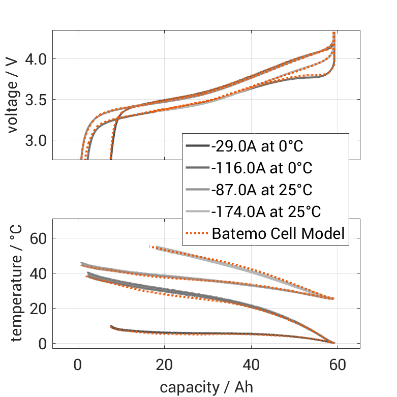 Batemo demon­strates the accuracy and validity of the Batemo Cell Model by comparing battery simula­tion and measure­ment data in the range given below. Valida­tion is exten­sive, exper­i­mental charac­ter­i­za­tion covers the total opera­tional area of the cell: At low and high temper­a­tures, up to the maximal current and in the whole state of charge range.