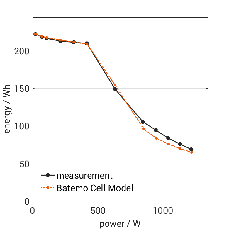 The cell is discharged from 100% SOC with different constant currents at 25°C. The thermal boundary condi­tion is free convec­tion. The measure­ment stops when reaching either the voltage of 2.8V or the surface temper­a­ture of 55°C. The graph shows the derived exchanged energy and average power of the experiment.