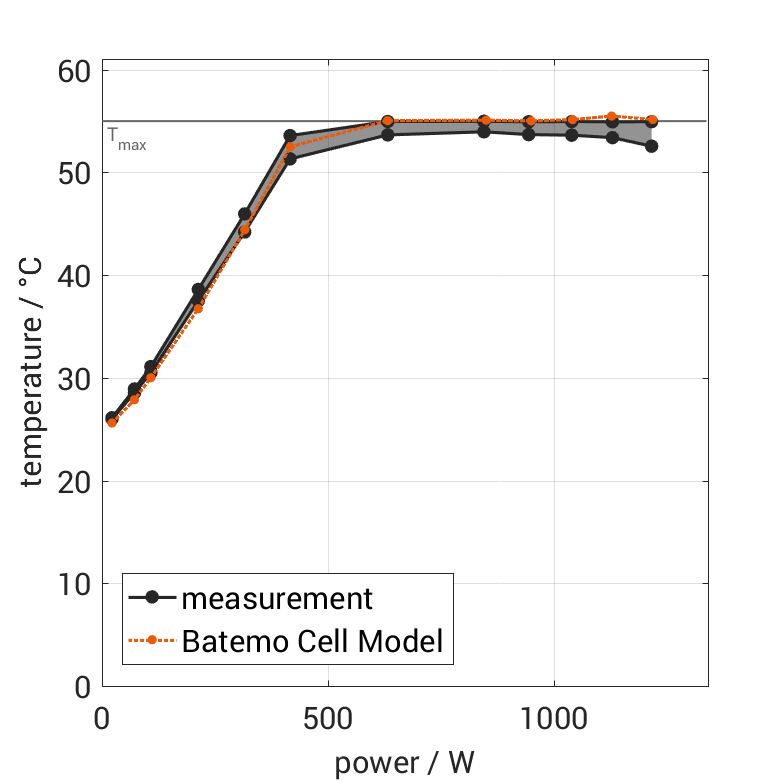 The cell is discharged from 100% SOC with different constant currents at 25°C. The thermal boundary condi­tion is free convec­tion. The measure­ment stops when reaching either the voltage of 2.8V or the surface temper­a­ture of 55°C. The graph shows the cell surface temper­a­ture at the end and the derived average power of the experiment.