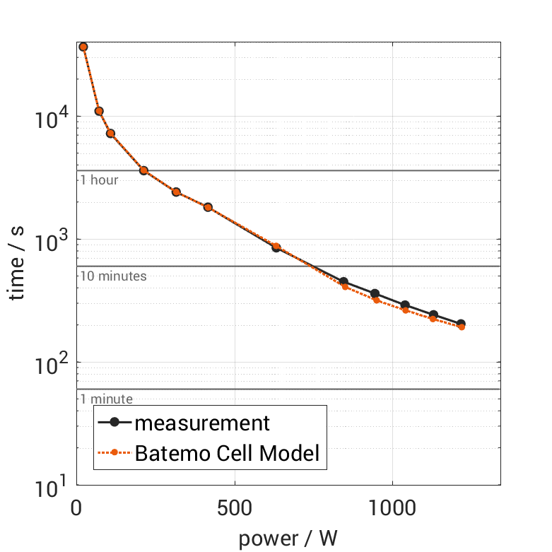 The cell is discharged from 100% SOC with different constant currents at 25°C. The thermal boundary condi­tion is free convec­tion. The measure­ment stops when reaching either the voltage of 2.8V or the surface temper­a­ture of 55°C. The graph shows the derived exper­i­ment duration and average power of the experiment.