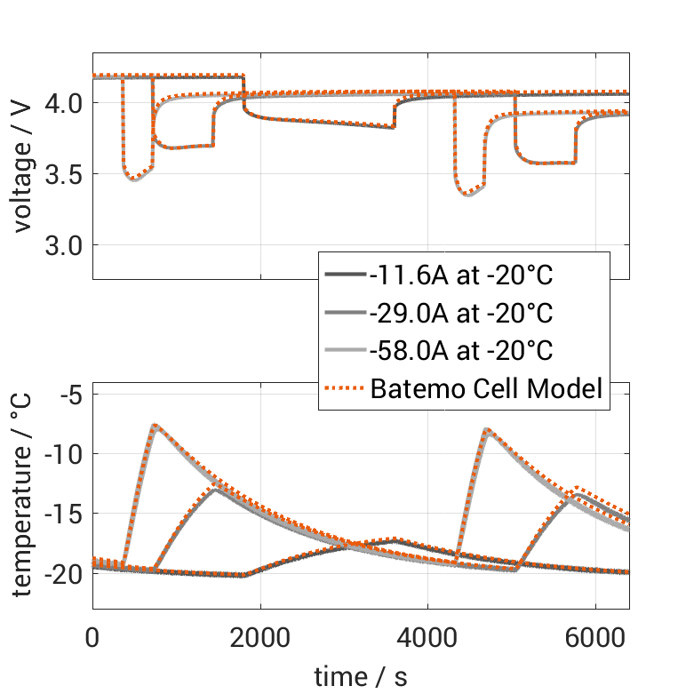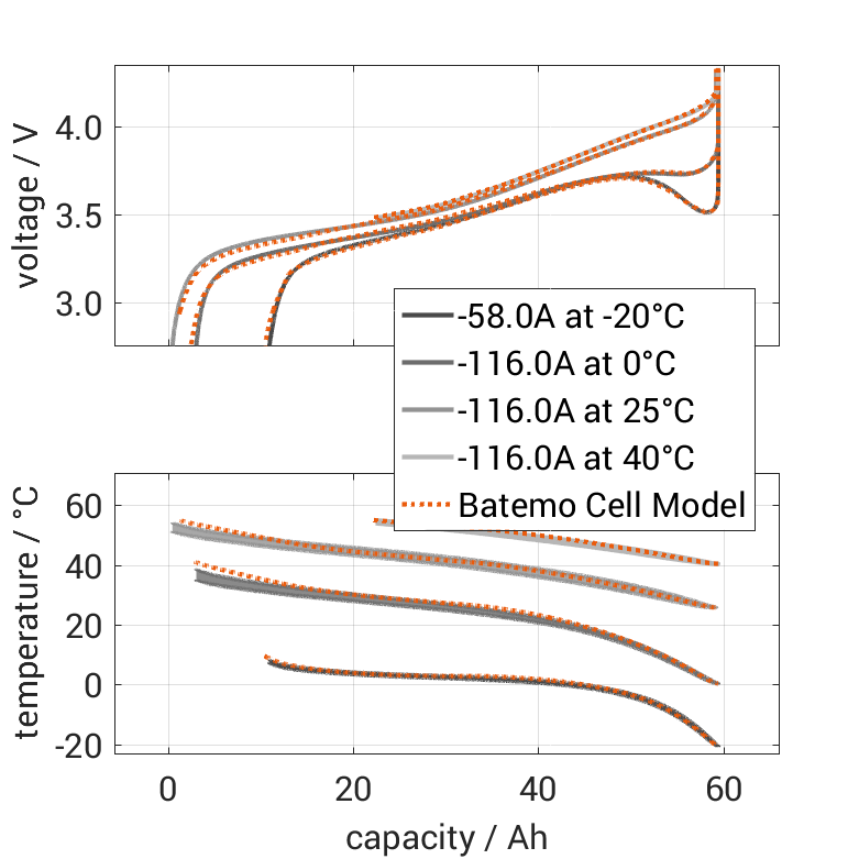 Batemo demon­strates the accuracy and validity of the Batemo Cell Model by comparing battery simula­tion and measure­ment data in the range given below. Valida­tion is exten­sive, exper­i­mental charac­ter­i­za­tion covers the total opera­tional area of the cell: At low and high temper­a­tures, up to the maximal current and in the whole state of charge range.