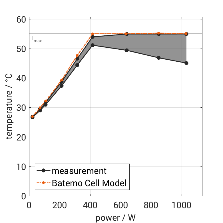 The cell is discharged from 100% SOC with different constant currents at 25°C. The thermal boundary condi­tion is free convec­tion. The measure­ment stops when reaching either the voltage of 2.8V or the surface temper­a­ture of 55°C. The graph shows the cell surface temper­a­ture at the end and the derived average power of the experiment.