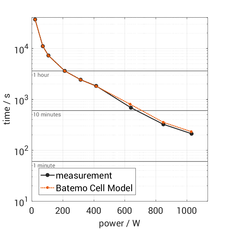 The cell is discharged from 100% SOC with different constant currents at 25°C. The thermal boundary condi­tion is free convec­tion. The measure­ment stops when reaching either the voltage of 2.8V or the surface temper­a­ture of 55°C. The graph shows the derived exper­i­ment duration and average power of the experiment.