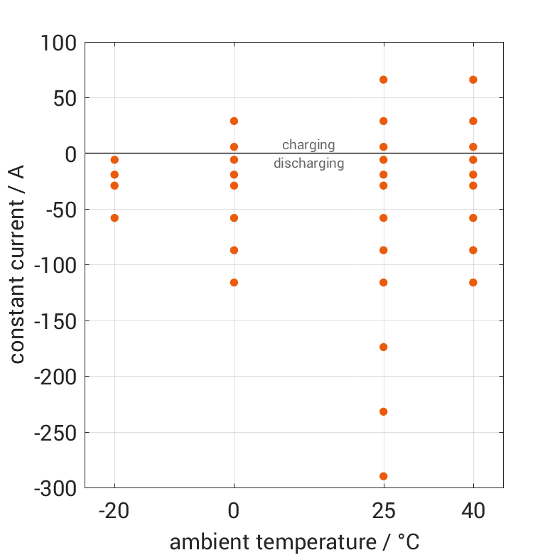 The cell is discharged from 100% SOC or charged from 0% SOC with current pulses followed by no-load phases at different ambient temper­a­tures. The thermal boundary condi­tion is free convec­tion. The measure­ment stops when reaching either the voltage of 2.8V or 4.3V or the surface temper­a­ture of 55°C. The graph shows for which ambient temper­a­tures and pulse currents measure­ments are available.