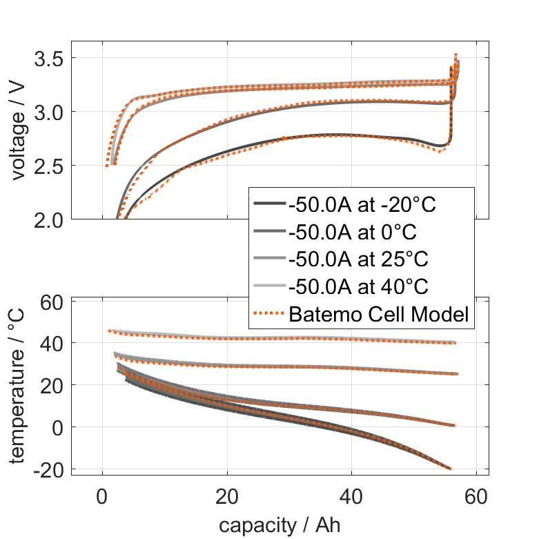 Batemo demon­strates the accuracy and validity of the Batemo Cell Model by comparing battery simula­tion and measure­ment data in the range given below. Valida­tion is exten­sive, exper­i­mental charac­ter­i­za­tion covers the total opera­tional area of the cell: At low and high temper­a­tures, up to the maximal current and in the whole state of charge range.